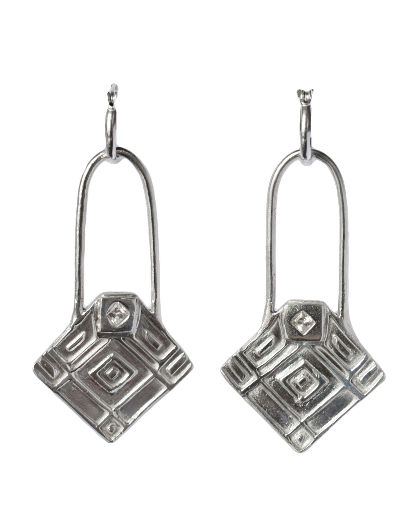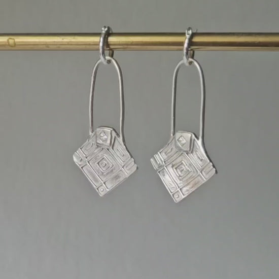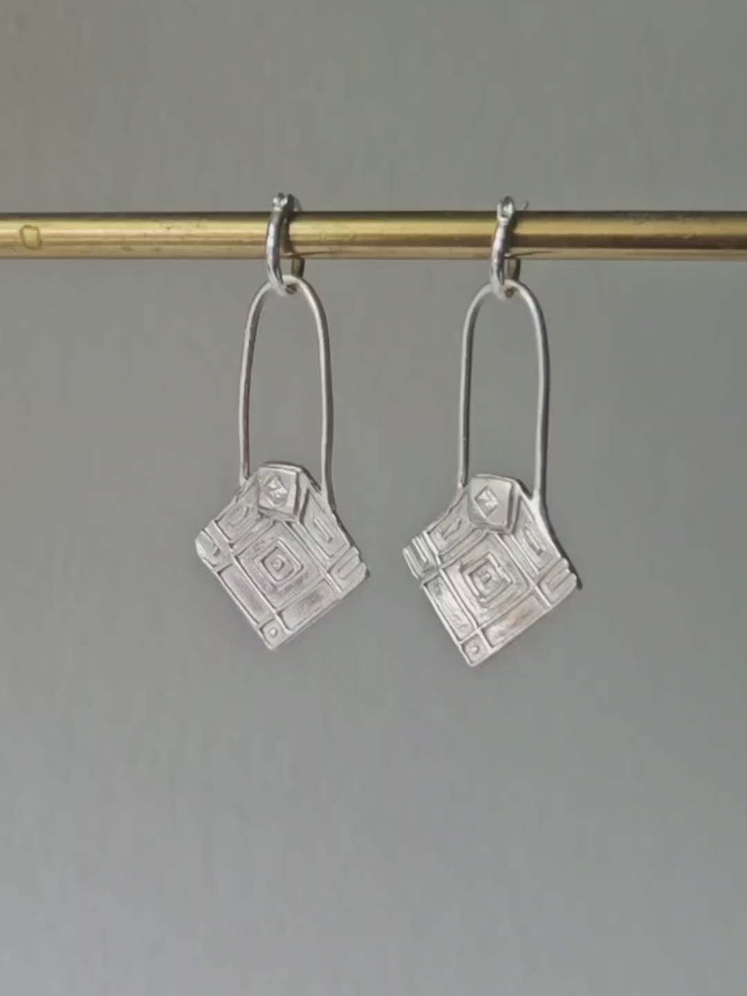 These earrings feel like fragments of a story long passed down, carved into silver and carried through time. I handcrafted each shape with a raised, textured pattern that hints at ancient symbols and quiet power. Hanging from long, slim arches, they dangle and move with you.