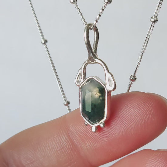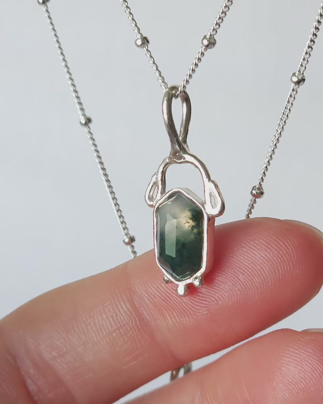 An earthy talisman that carries a living landscape within. This pendant holds a moss agate, with green inclusions that look like a tiny, ethereal forest. The handmade silver setting curves organically around the stone, creating the sense of something grown rather than forged. Moss agate has long been seen as a stone of nature’s wisdom, grounding, and renewal—a quiet companion for those who find magic in forests, gardens, and all growing things.