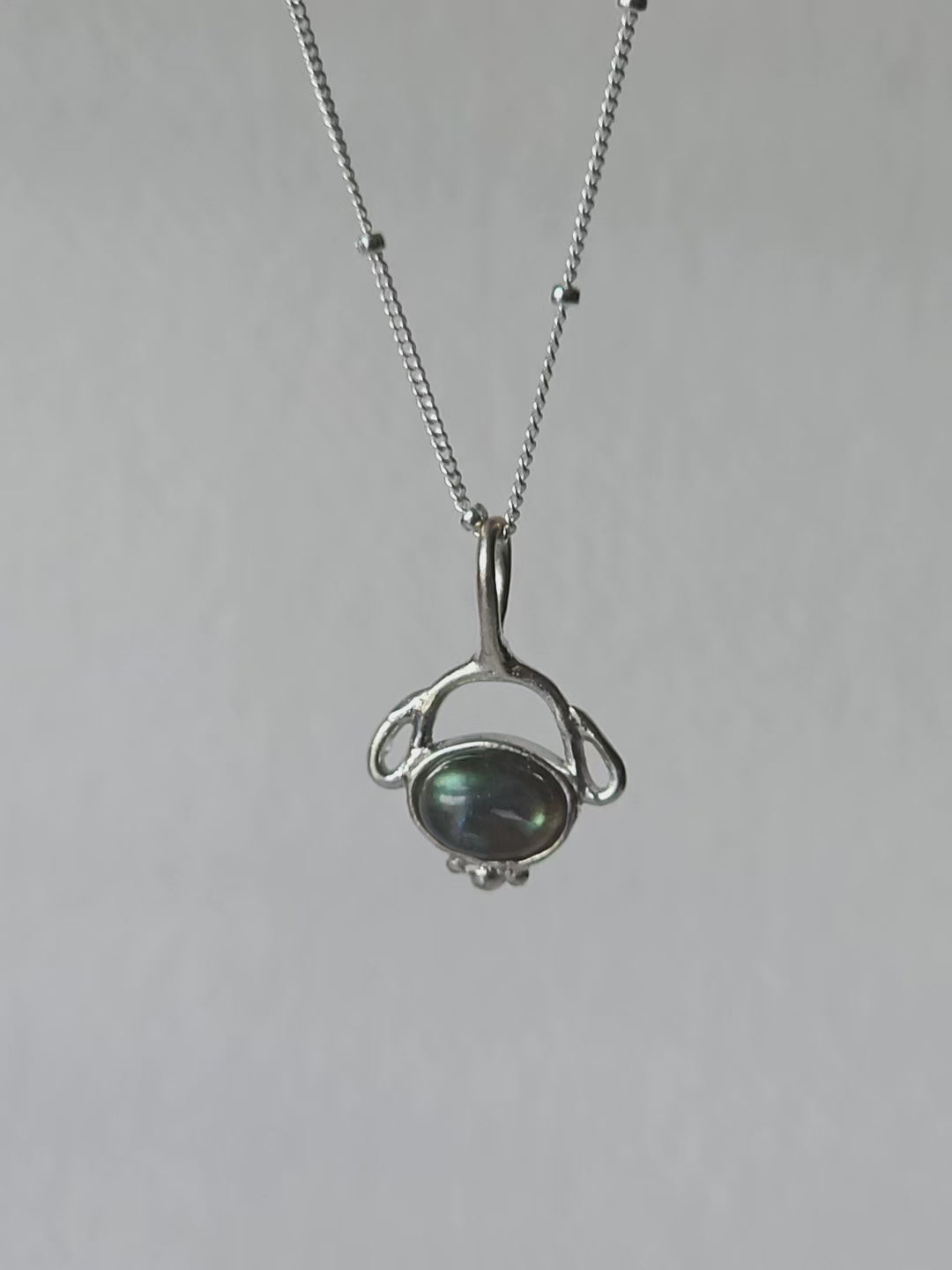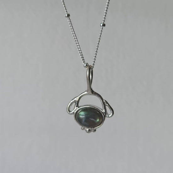 A mystical amulet for seekers and dreamers. This pendant features a natural labradorite, its shifting blue-green fire looks like trapped northern lights. The silver frame is sculpted by hand in fluid, organic lines that evoke ancient relics and timeless magic. Thought to be a stone of intuition and protection, labradorite makes this necklace a quiet talisman for inner vision, mystery, and personal transformation.