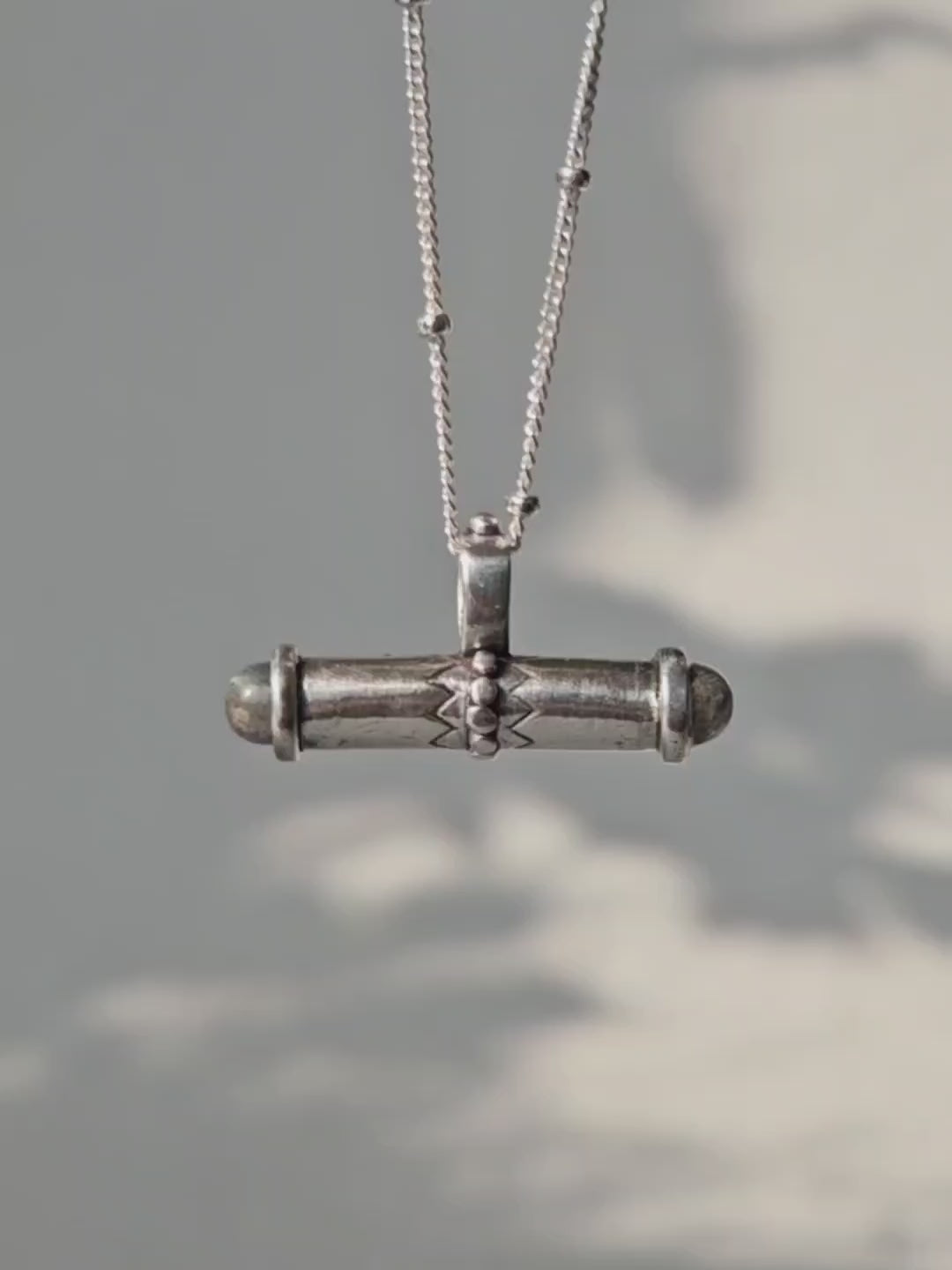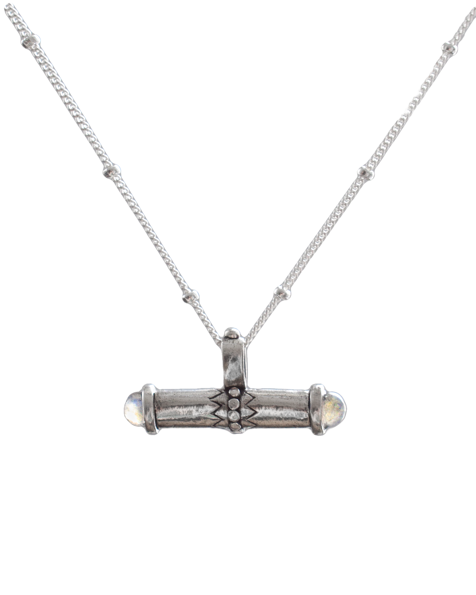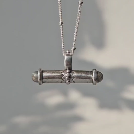 This necklace was made to hold a sense of calm in motion. I designed it around symmetry and contrast — silver and stone, weight and air, shine and patina. At its sides is labradorite, a gem known for its shifting flashes of blue and green, said to protect your energy and spark inner clarity.