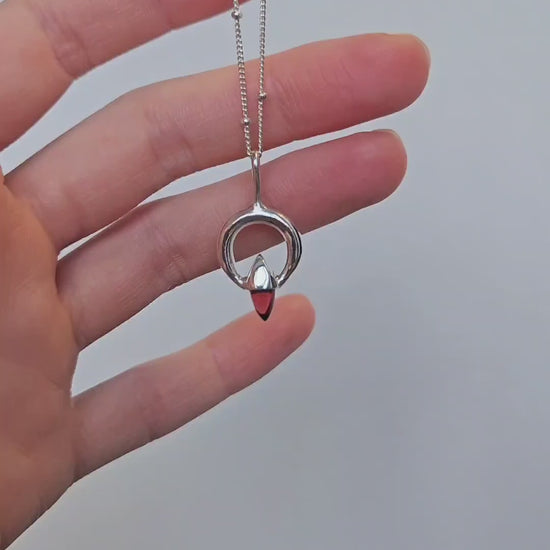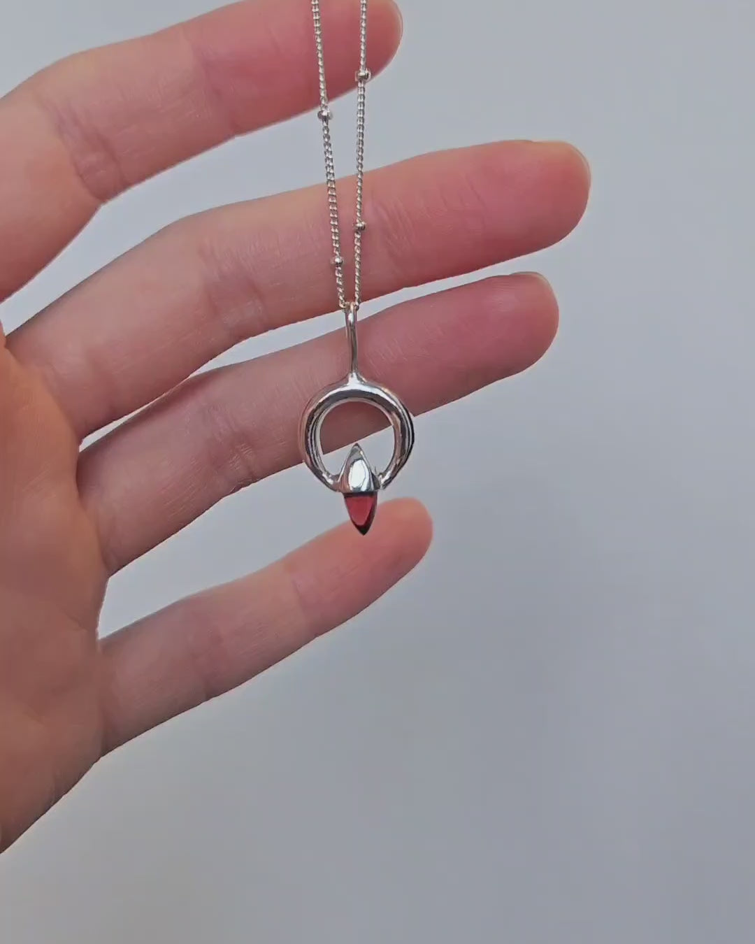 A handmade crescent form curves downward like horns: a nod to Capricorn’s mythical sea-goat and its earthy determination. At the center is a deep, bullet-shaped garnet, a symbol of fire and passion. Garnet is said to fuel motivation, protect your energy, and help turn long-term visions into success.