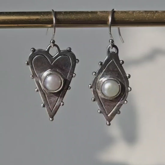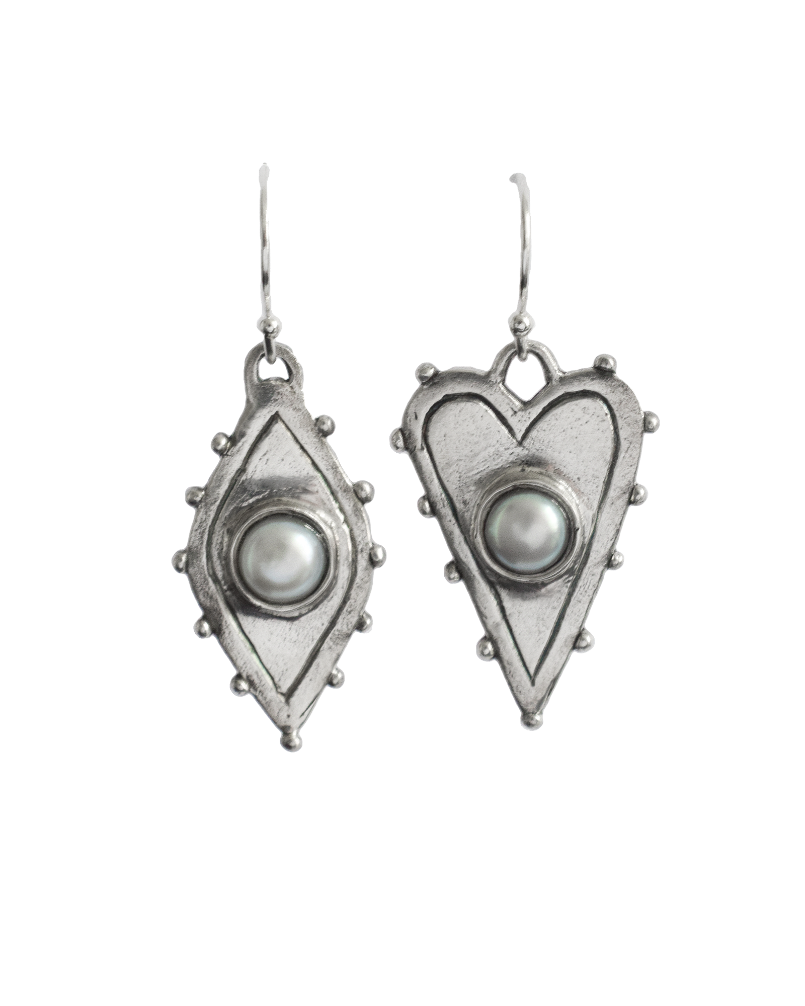 These asymmetric earrings feature two pendants - a heart and an eye. Evil eye is a symbol of protection in many cultures, believed to guard its wearer from misfortune, jealousy and hurt.