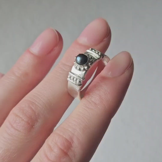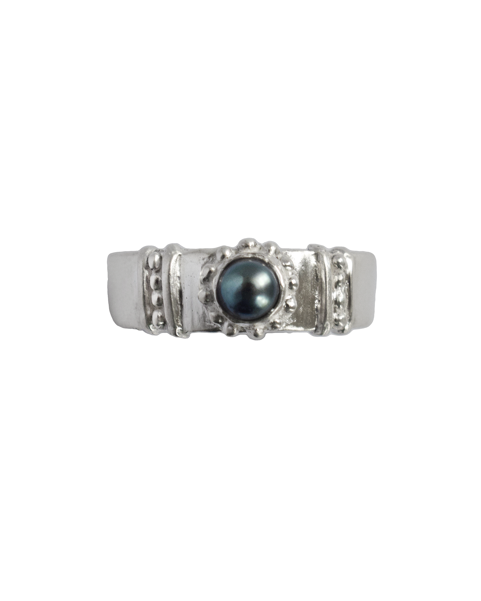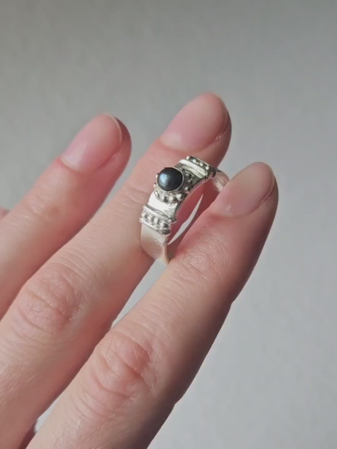 A story about a romantic adventure in a wild sea, a thrilling passion on the edge of risk. A black pearl, smooth and dark, like a treasure pulled from a pirate’s chest. Surrounded by tiny silver beads and lines that add texture and depth.
